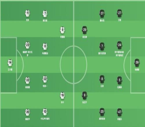 北京国安首发:39-张健智、47-邓捷夫、5-拉莫斯、24-阿不都海米提、27-王刚、37-曹永竞、7-塞尔吉尼奥、8-孔特20-恩科洛洛、9-张玉宁、29-法比奥
