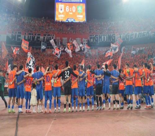 去年8月31日,6:0大胜国安后,泰山球员与球迷一起庆祝。(泰山俱乐部供图)